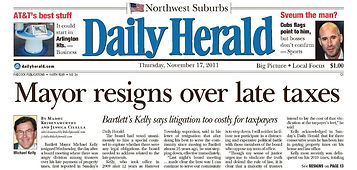 Bartlett Village President Michael Kelly resigned abruptly in November 2011, shortly after acknowledging he was late in paying property taxes on his home and law office for three consecutive years.